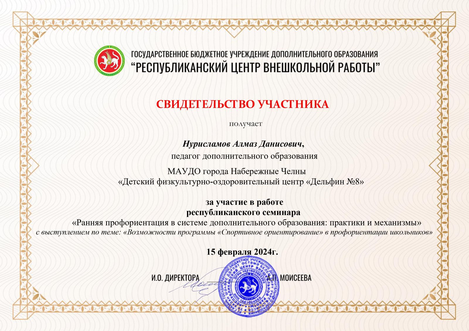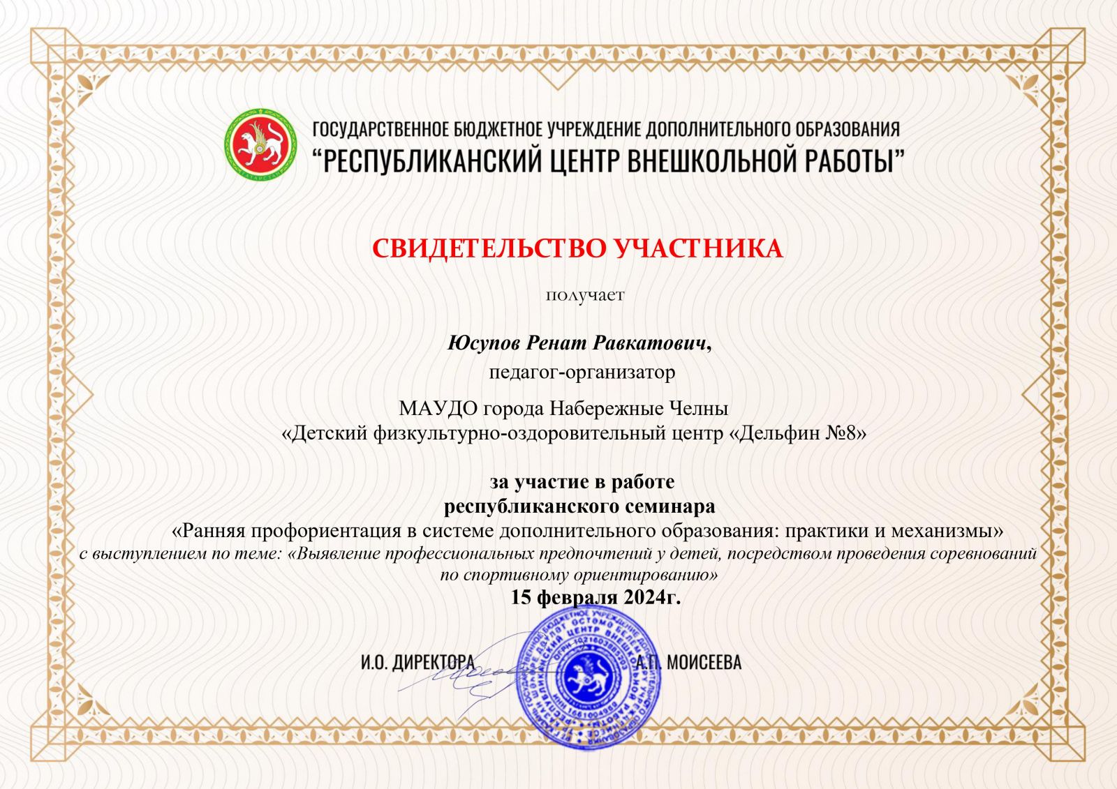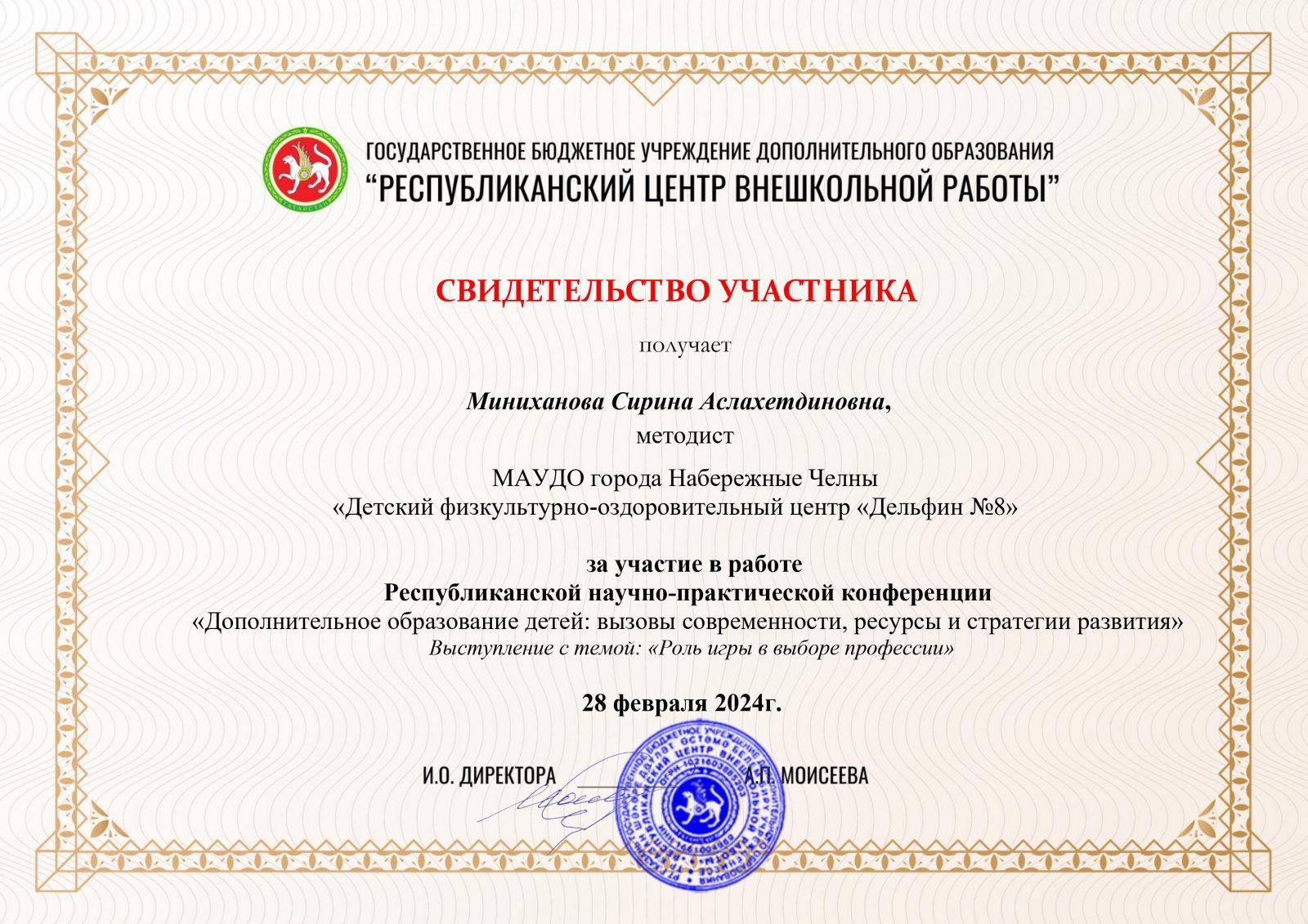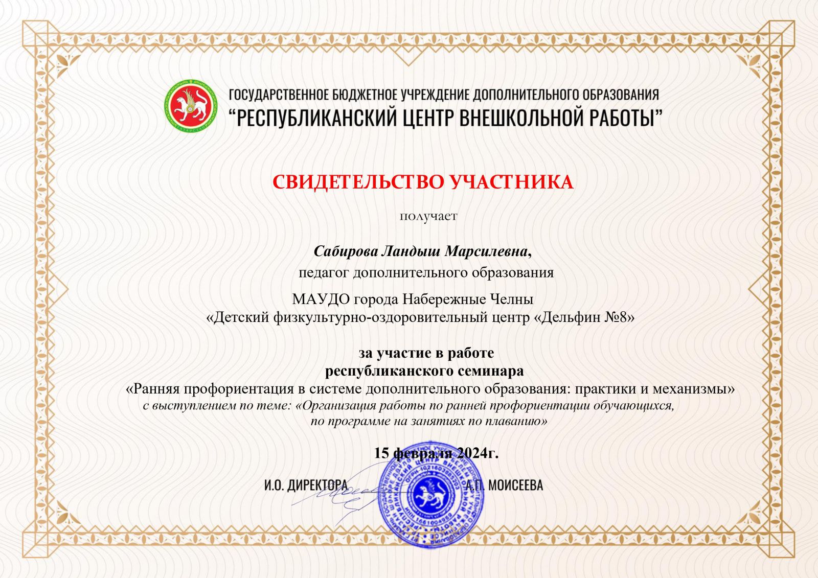 - Благодарность Цыганову И.В., Благодарность Ильиной Г.Ф., Арзамасцева Р.В., Борознова Г.А., Валинуров Р,Р., Гильванова Н.А., Костенко Ю.В., Миниханова С.А., Нурисламов А.Д., Сабирова Л.М., Щипицын В.В., Юсупов Р.Р., Дубовая М.М., Ермолаева А.Д., Ильина Г.Ф., Миниханова С.А., Михейкина Н.Р., Таушев С.С., Цыганов И.В., Шапошников А.П., Щипицын С.В. приняли участие в работе Республиканского семинара "Ранняя профориентация в системе дополнительного образования: практики и механизмы" (15.02.24)