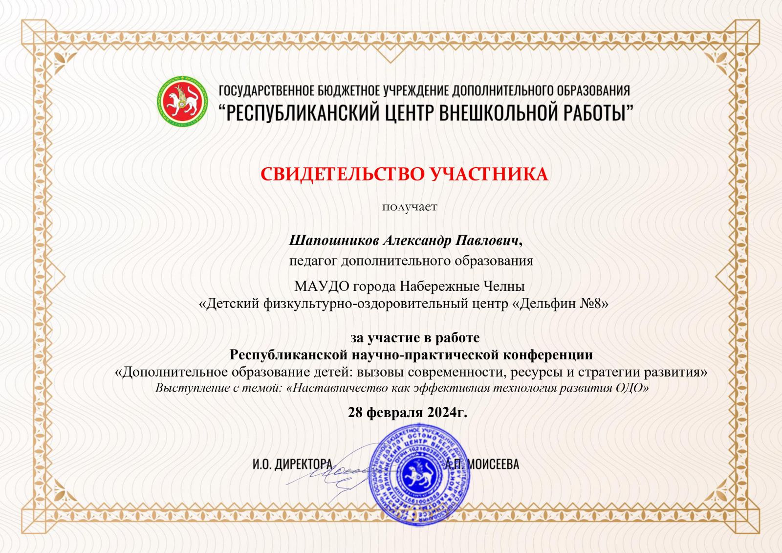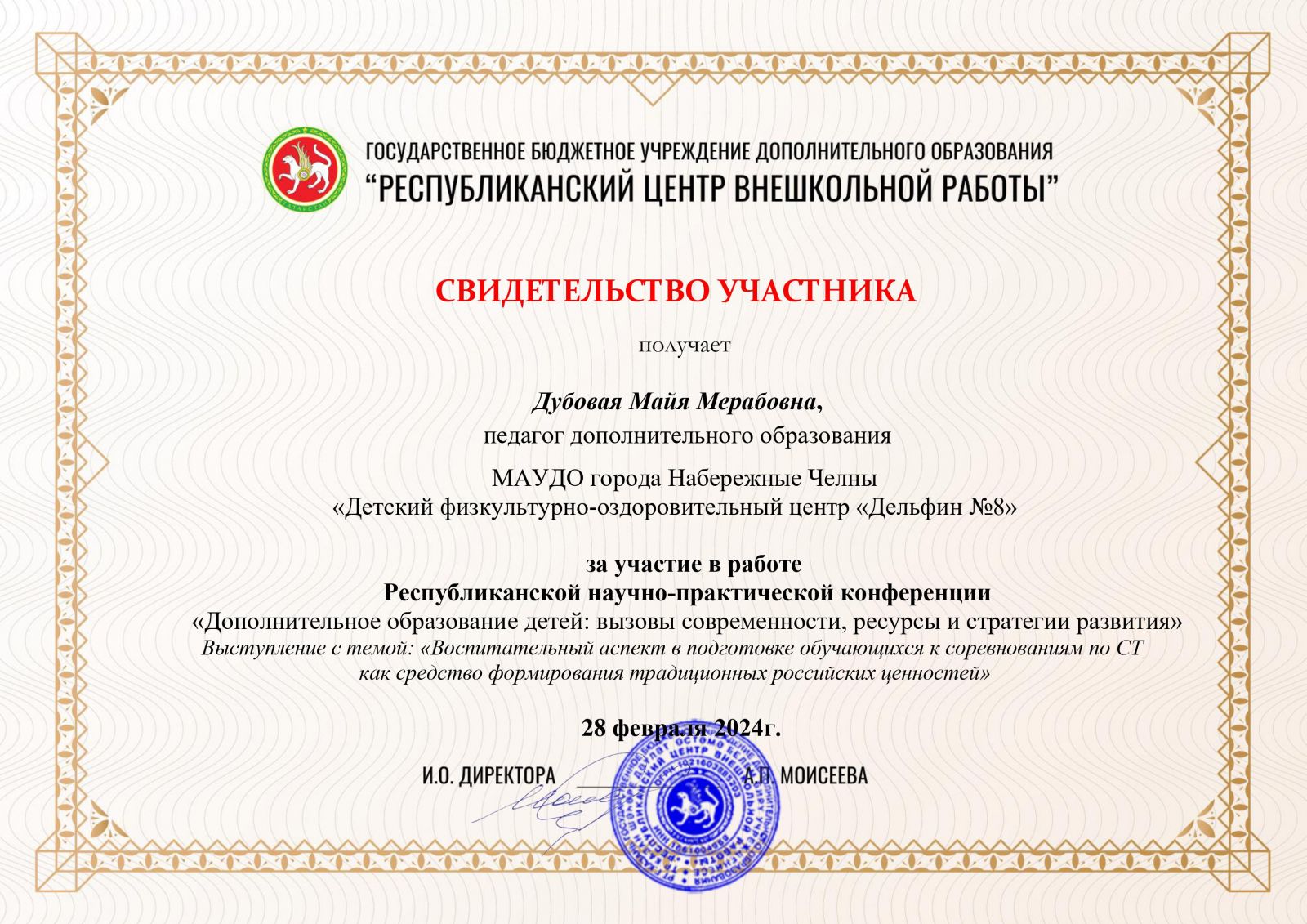 - Гильванова Н.А., Дубовая М.М., Ильина Г.Ф., Миниханова С.А., Шапошников А.П. приняли участие в работе Республиканской научно-практической конференции "Дополнительное образование детей: вызовы современности, ресурсы и стратегии развития" (28.02.24)