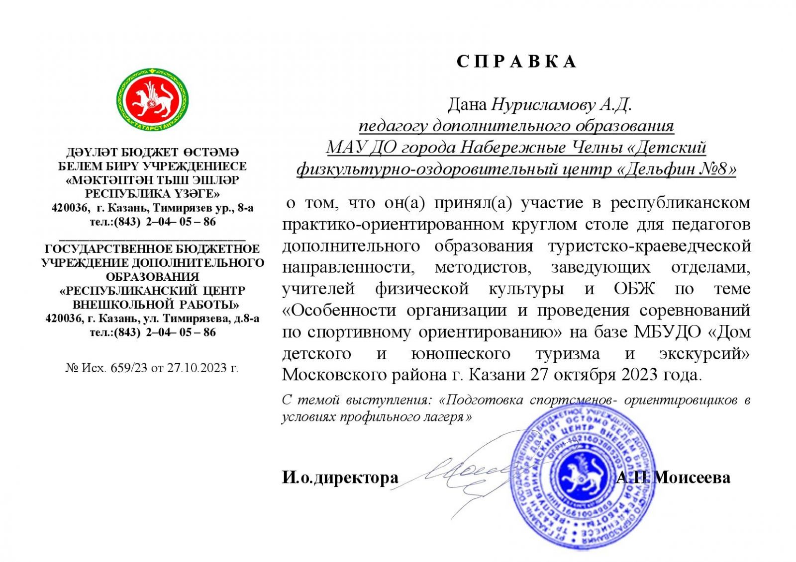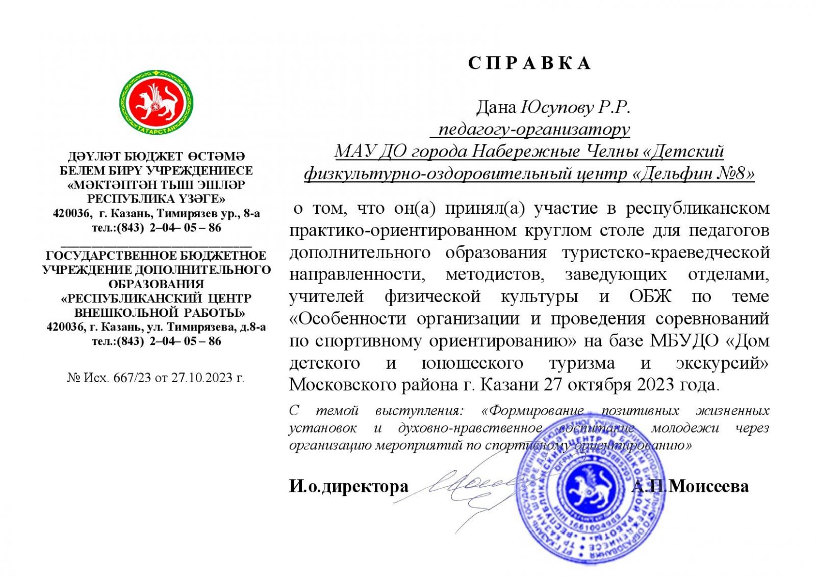 - Нурисламов А.Д, Самарин И.В., Юсупов Р.Р. приняли участие в республиканском практико-ориентированном круглом столе для педагогов дополнительного образования туристско-краеведческой направленности, методистов, заведующих отделами, учителей физической культуры и ОБЖ по теме "Особенности организации и проведения соревнований по спортивному ориентированию" (27.10.23)