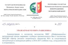 Администрация и коллектив методистов МБУ «Информационно-методический центр» выразил глубокую признательность директору и коллективу МАУ ДО «ЦДТТ № 5» за плодотворную методическую и конкурсную работу в 2016-2017 учебном году, сотрудничество и отзывчивость. Работа сотрудников ЦДТТ № 5 оценена как интенсивная, эффективная и бескорыстная.«Мы высоко ценим сотрудничество с Вами и надеемся на дальнейшее продолжение продуктивной работы. Желаем руководителю и коллективу Центра детского технического творчества № 5 слаженной работы, творческих успехов, здоровья и процветания на долгие годы! Спасибо Вам от всего сердца!» - такими словами закончено благодарственное письмо от Информационно-методического центра. -