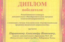 Наш педагог Салихин Юрий Александрович по результатам плодотворной работы был признан как «Лучший руководитель технического кружка дополнительного образования детей» и был приглашен на награждение ценным подарком , поздравление министра промышленности и торговли Республики Татарстан Каримовым А.А. -