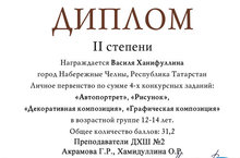 Поздравляем Ханифуллину Василю с дипломом II степени за личное первенство по сумме 4-х конкурсных заданий "Автопортрет", "Рисунок", "Декоративная композиция", "Графическая композиция" в возрастной группе 12-14 лет по итогам участия во VII Всероссийском юношеском конкурсе изобразительного искусства с международным участием "Медный всадник". Преподаватели: Акрамова Г.Р., Хамидуллина О.Р.
