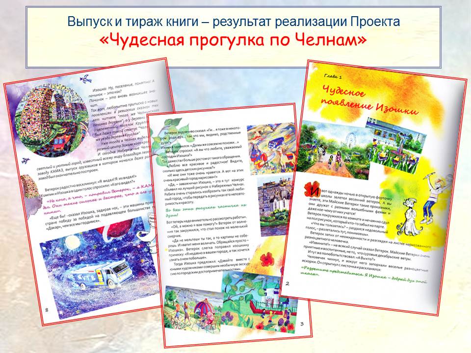Реализация социально-ориентированного учрежденческого проекта "Дети-детям" с выпуском книги посвященной городу Набережные Челны "Чудесная прогулка по Челнам". Автор текста: Людмила Дорженковская, иллюстрации: учащиеся ДХШ №2.