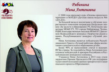 С 2000 года преподает в школе ДА-ДА курс «Основы проектного черчения». За большой вклад в воспитание и обучение подрастающего поколения награждена Нагрудным знаком «За заслуги в образовании» РТ, Почетной грамотой Министерства образования и науки РТ, Почетной грамотой Управления образования г. Набережные Челны, отмечена Благодарственным письмом Министерства образования и науки РТ, а также дипломами конкурсов и олимпиад за выдающийся вклад в развитие детского архитектурно-художественного образования. Нина Антоновна является победителем Республиканского Гранта «Лучший работник сферы воспитания и дополнительного образования детей».Более 95% ее выпускников учатся в ведущих ВУЗах нашей страны и зарубежья. За годы работы Нина Антоновна подготовила победителей и призеров Российских и Республиканских конкурсов и олимпиад. Учащиеся Нины Антоновны в 2013 году стали лауреатами Премии Президента РФ для поддержки талантливой молодежи в рамках приоритетного национального проекта «Образование».
