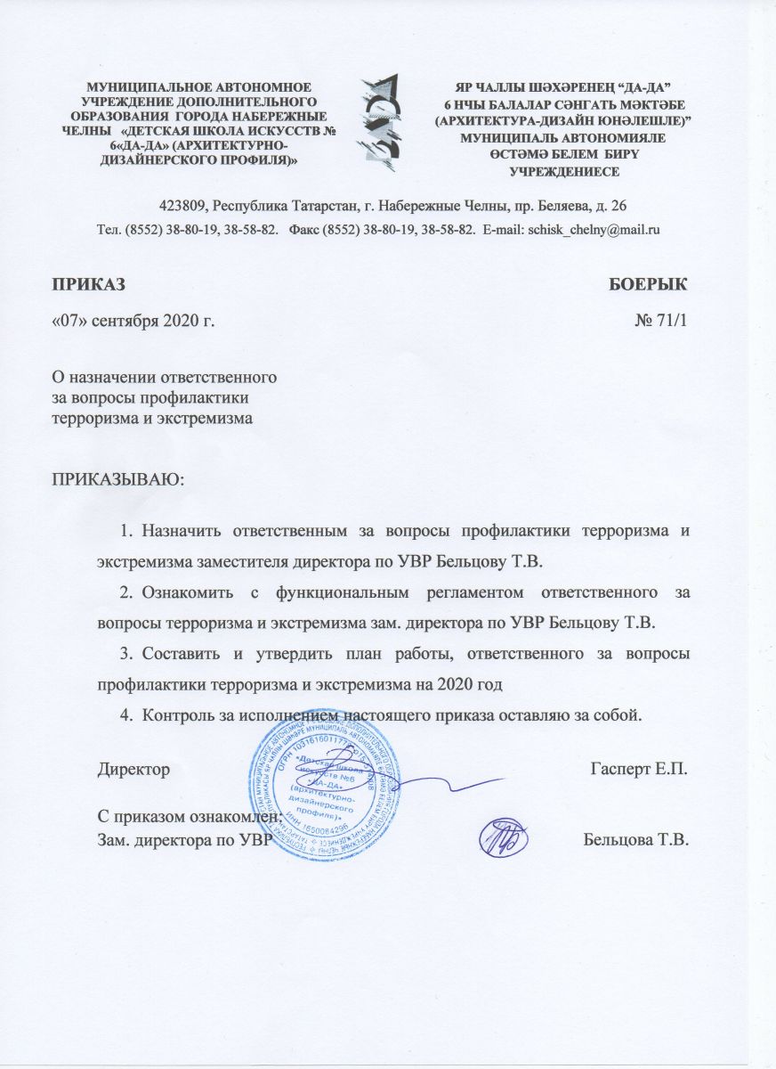 Приказ о назначении ответственного за вопросы профилактики терроризма и экстремизма