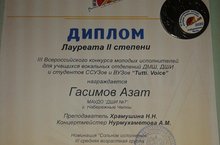 Поздравляем Гасимова Азата (преподаватель Храмушина Н.Н., концертмейстер Нурмухаметов А.М.), завоевавшего Диплом Лауреата IIстепени в III Всероссийском конкурсе молодых исполнителей для учащихся вокальных отделений ДМШ, ДШИ и студентов ССУЗов и ВУЗов «Tutti. Voice» в номинации «Сольное исполнение»!