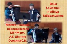 23 октября в колледже искусств в рамках фестиваля "Родники России" прошли мастер-классы преподавателя Московского государственного института имени А.Г. Шнитке Осокина Сергея Викторовича, где участвовали учащиеся нашей школы: Габдрахманов Айнур (преп. Шигапова Г.М.) и Самаркин Илья (преп. Семенова В.М.)