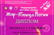 Поздравляем учащихся вокального отделения ДШИ №13 (т): Ибрагимова Ильфата (лауреат 1 степени), Хлыстову Дарину (лауреат 1 степени), Фиткулову Ясмину (лауреат1 степени), Мухаммадиева Тагира (лауреат1 степени), Вахитову Алию (лауреат 1 степени), вокальный ансамбль «Голчэчэк» (лауреат 1 степени), Вахитова Камиля (лауреат 2 степени) с успешным выступлением на международном фестивале-конкурсе «Жар - птица России»! Желаем дальнейших творческих побед!