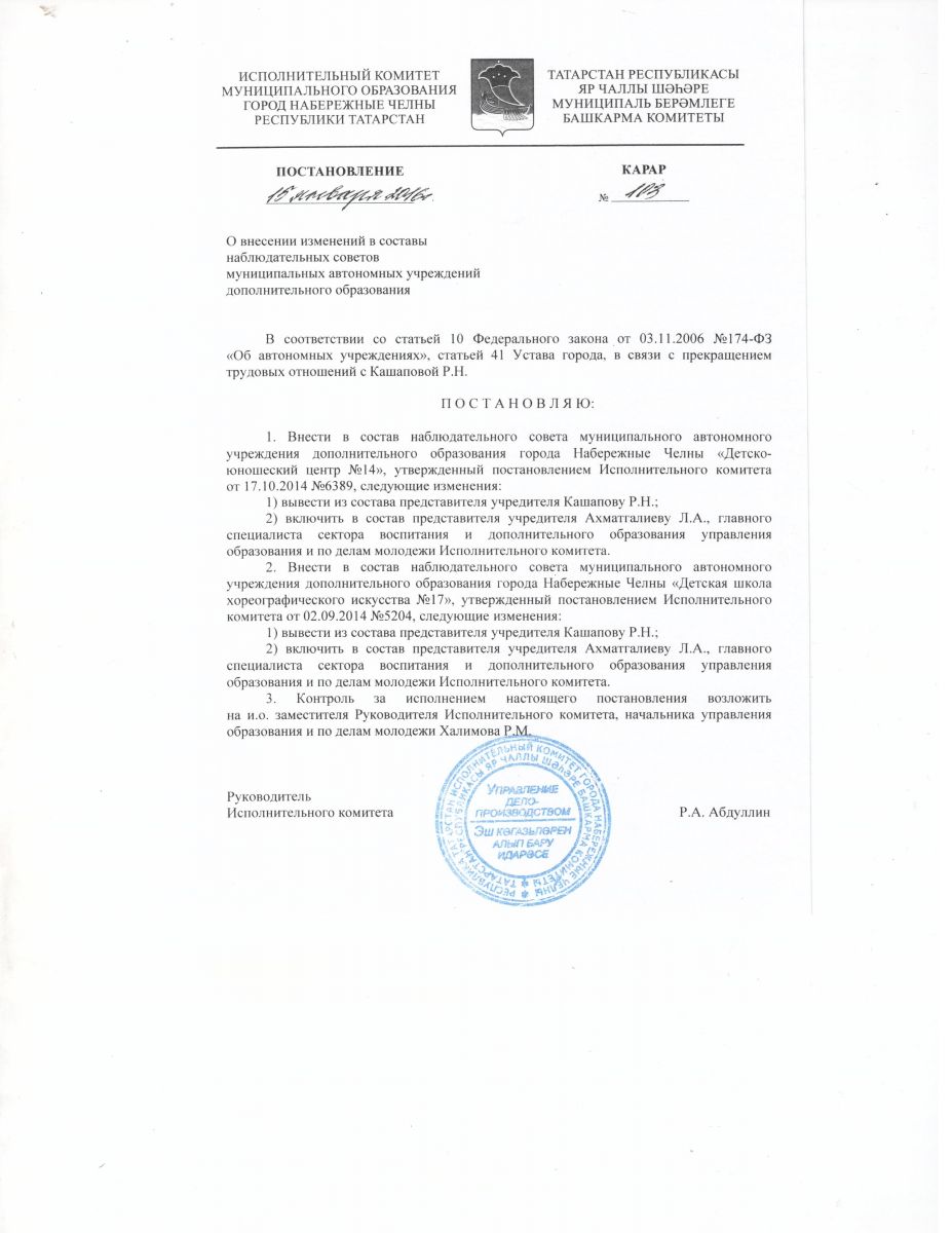 Постановление о внесении изменений в состав наблюдательного совета 2016 год