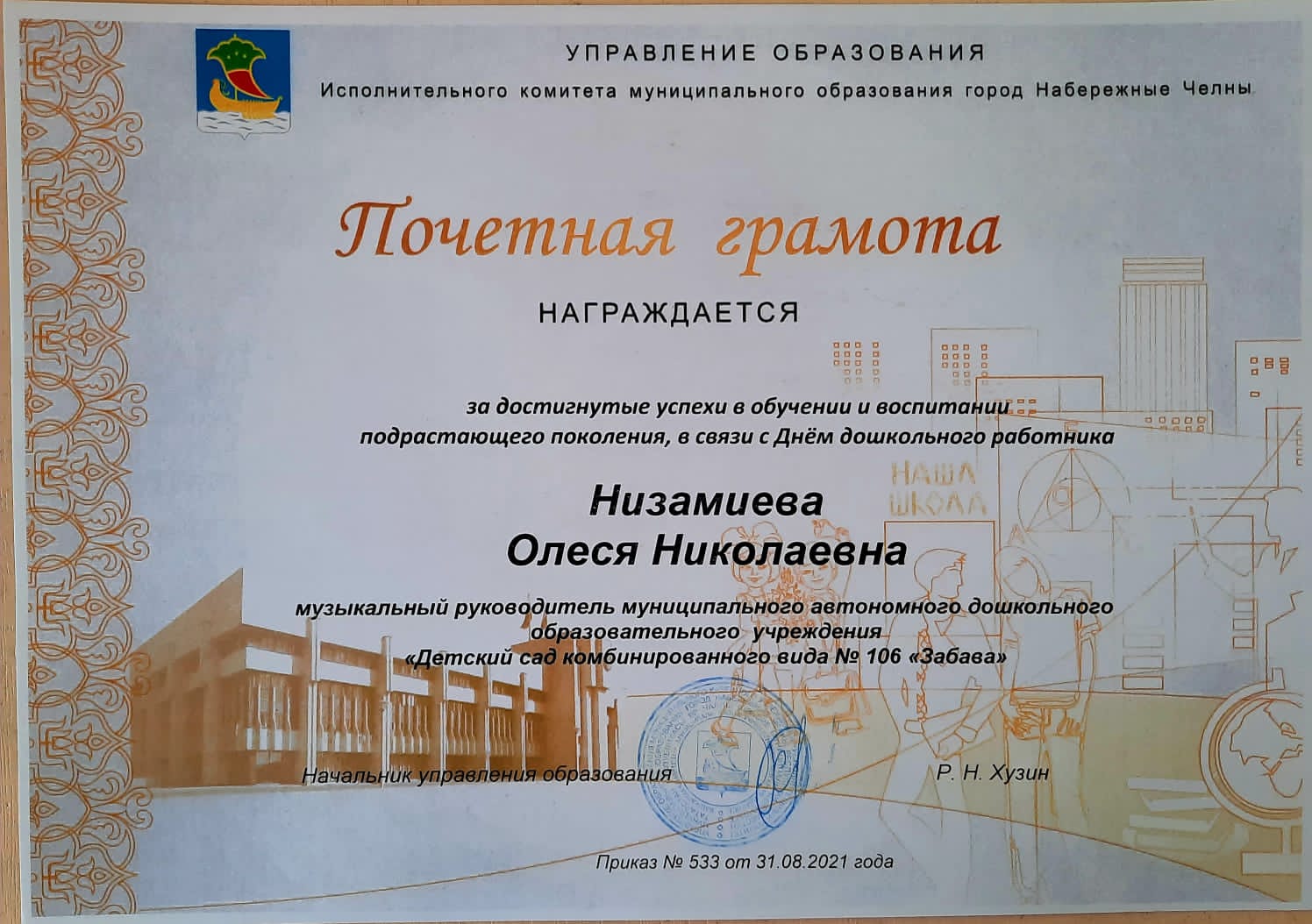15-ти лучшим руководителям и педагогическим работникам образовательных учреждений вручили Сертификаты о занесении на Городскую Доску Почета. Среди них музыкальный руководитель нашего детского сада - Олеся Николаевна! Поздравляем!!!