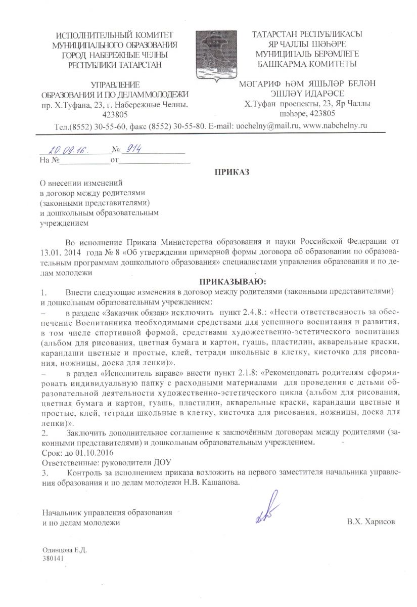 «В соответствии с Приказом Министерства образования и науки Российской Федерации от 13.01. 2014 года № 8 «Об утверждении примерной формы договора об образовании по образовательным программам дошкольного образования» внесены изменения в форму договора между родителями (законными представителями) и дошкольным образовательным учреждением. Изменения утверждены приказом управления образования и по делам молодежи № 914 от 20.09.2016 г.»