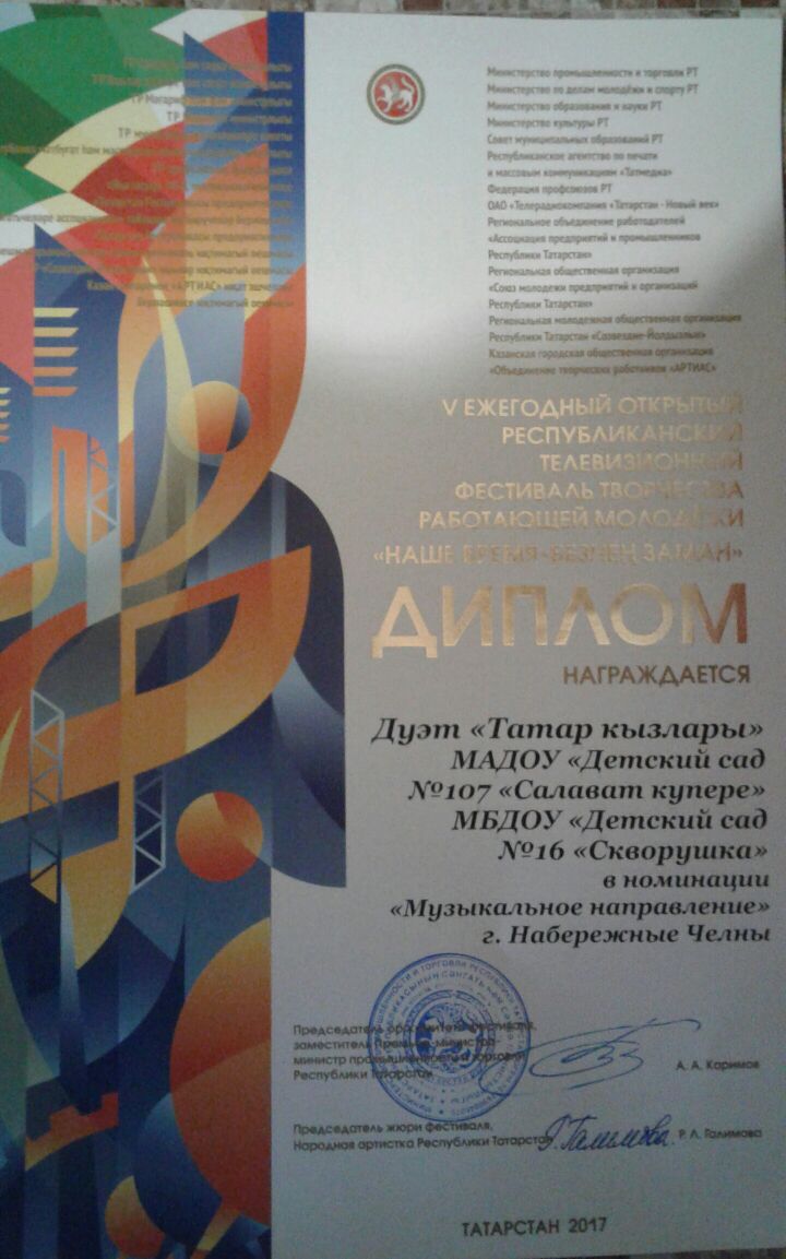 6-7 октября в концертном зале ДК Камаза прошёл V ежегодный открытый республиканский телевизионный фестиваль творчества работающей молодёжи "Наше время-Безнем заман", в котором участвовала наша сотрудница Вахитова Римма совместно с муз.руководителем МБДОУ №16 "Скворушка". Получив диплом в номинации "Музыкальное направление" МОЛОДЦЫ ДЕВОЧКИ.