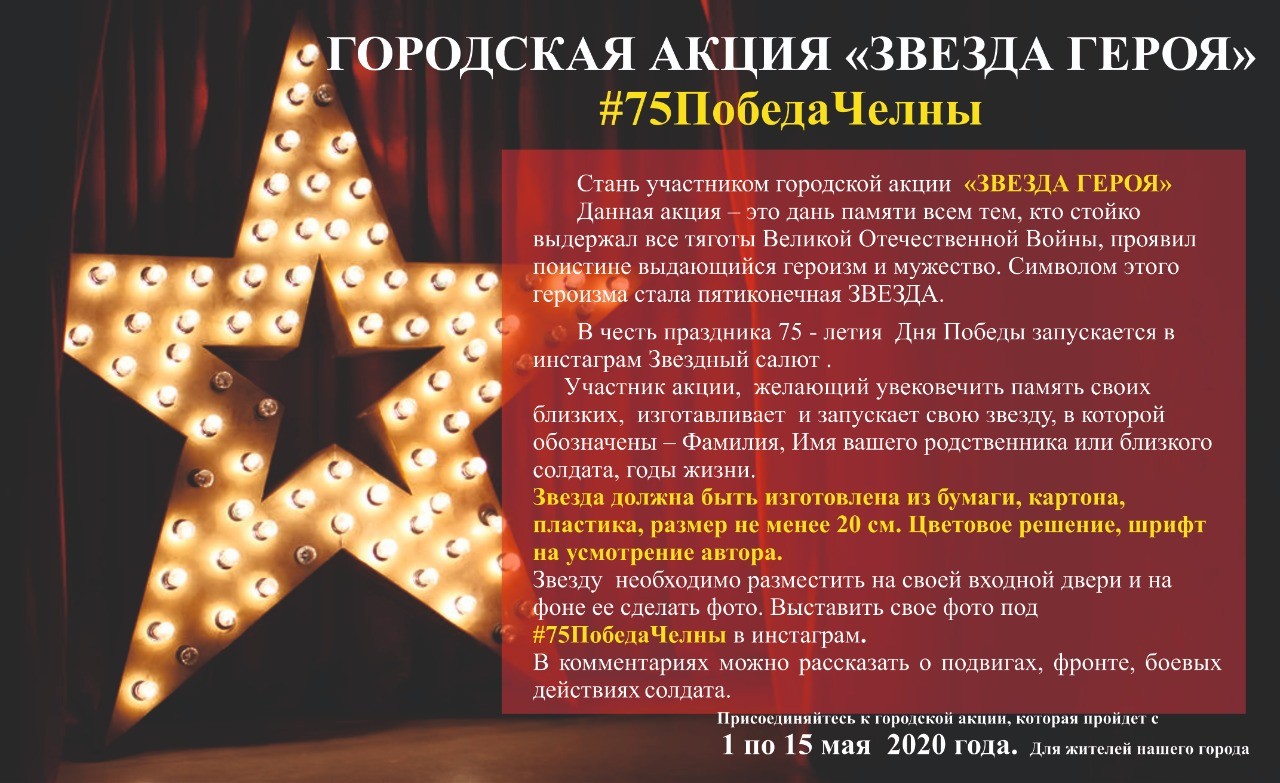 Торжественное празднование 75‑летия Победы — это целый комплекс мероприятий, который будет проходить в каждом регионе нашей страны.Мы представляем вашему вниманию положения и афиши о проведении акций "Бессмерный полк", "Звезда героя" #75ПобедаЧелны. Вы можете принять участие в акциях и почтить память Героев Великой Отечественной Войны.