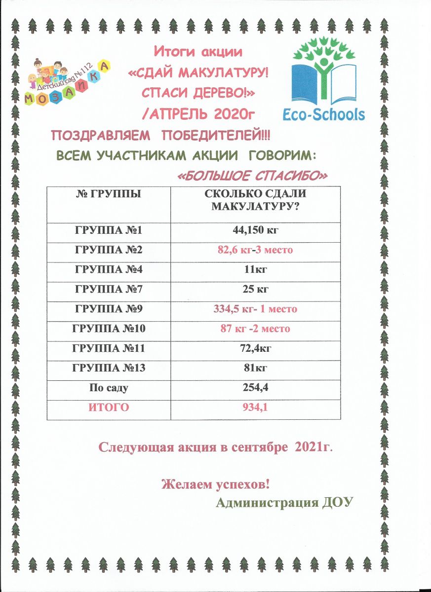 Опубликовано: 23.04.2021В детском саду в апреле 2021 года прошла акция "Сдай макулатуру -спаси дерево!". Выражаем огромную благодарность всем усчастникам за активное участие. Итоги по сбору макулатуры