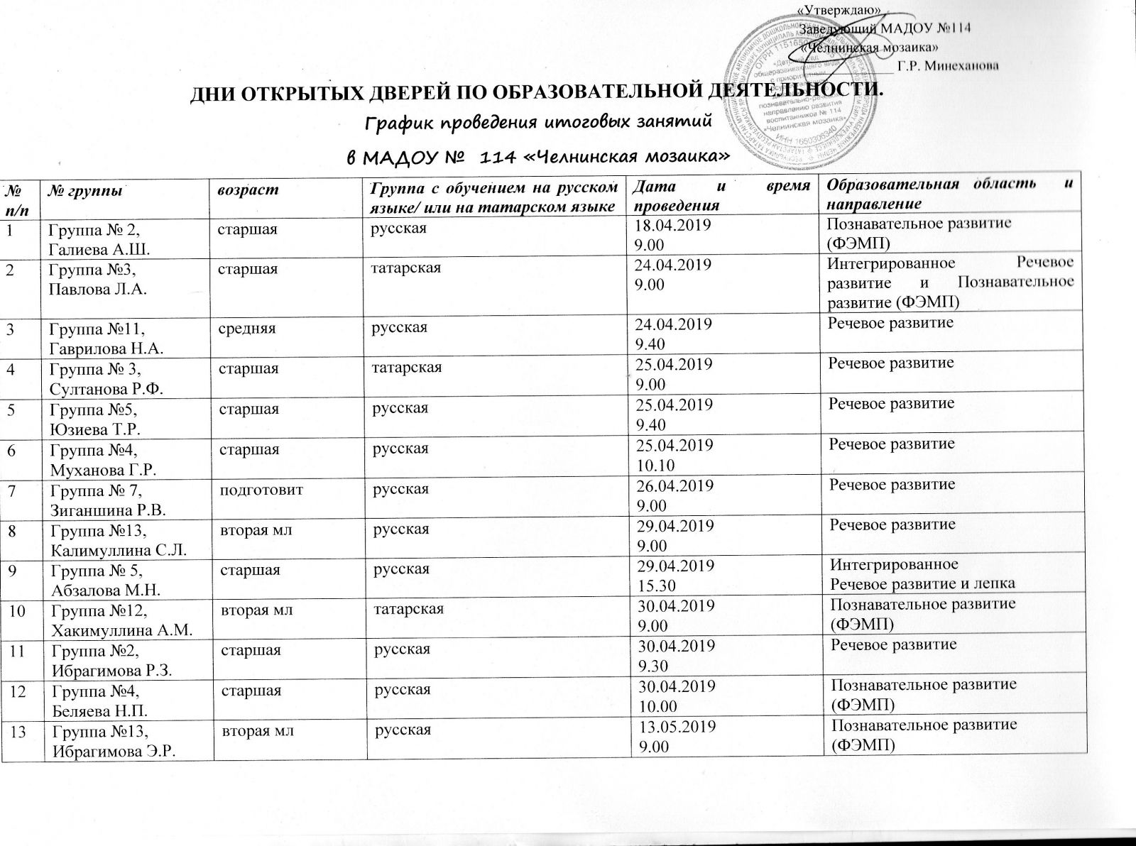 В рамках "Дни открытых дверей для родителей" по образовательной деятельности с 18 апреля по 30 апреля 2019 года во всех возрастных группах проводятся итоговые открытые занятия. Приглашаем всех желающих родителей посетить открытые занятия. График смотрите далее, жми
