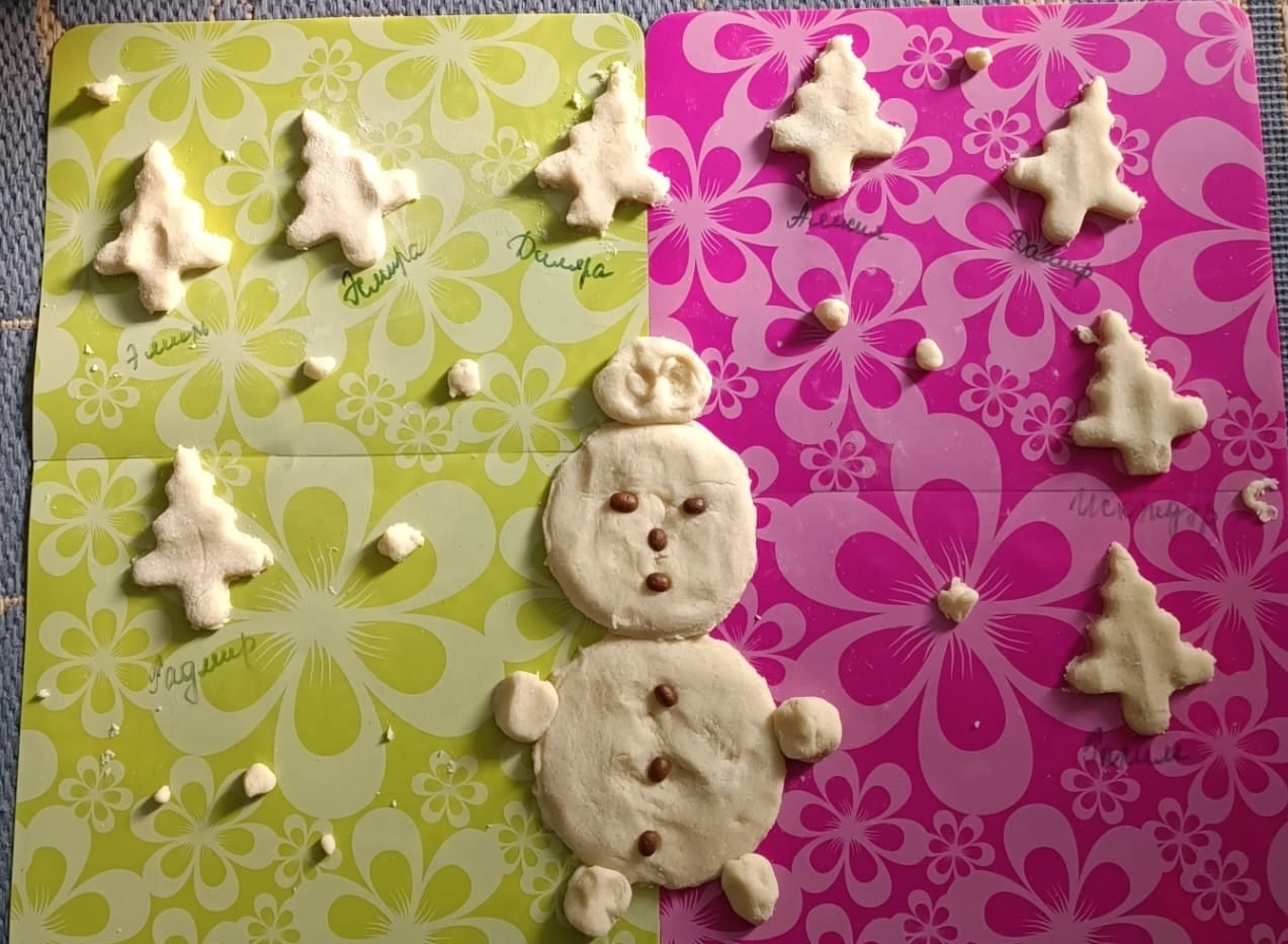 Самые маленькие воспитанники занимались сегодня тестопластикой, коллективная работа, тема "Зимняя сказка".