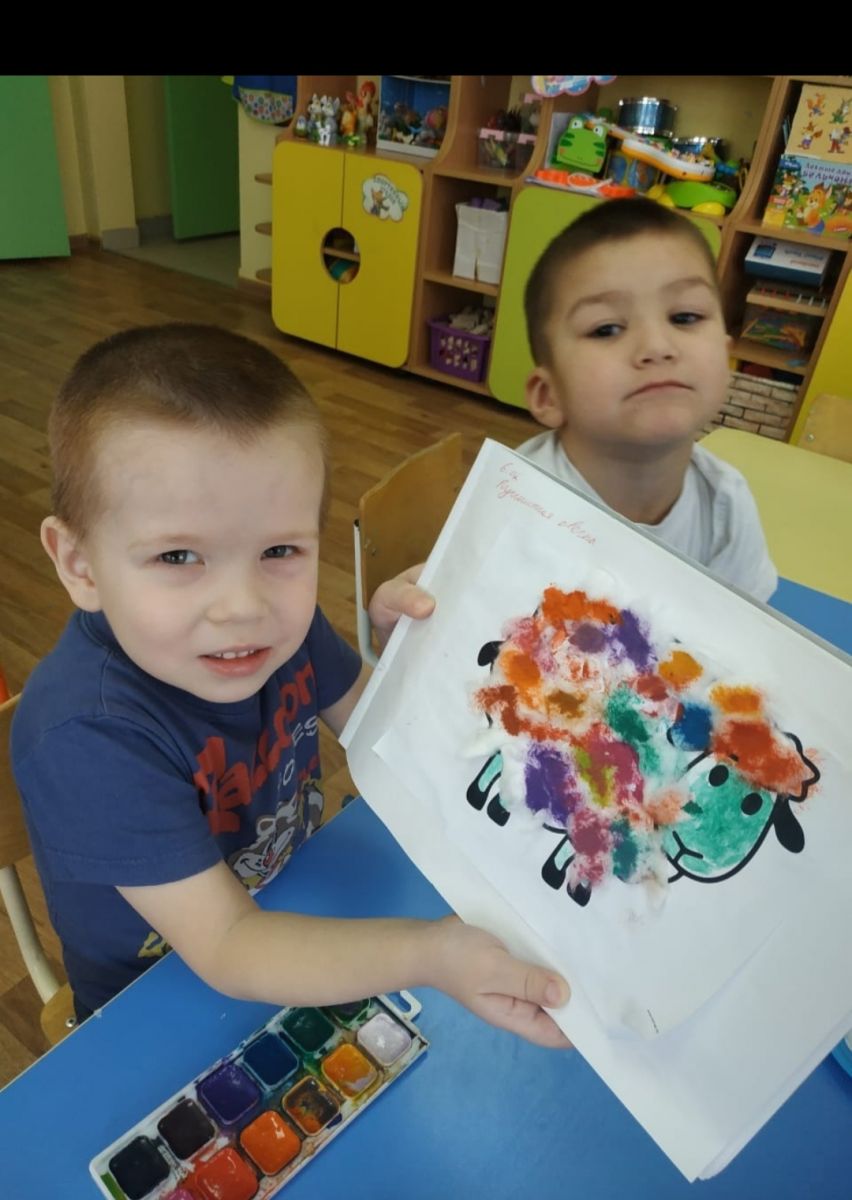 Вот такую пушистую овечку с помощью ватных дисков и красок изготовили воспитанники группы 9 под руководством воспитателя Анастасии Дмитриевны. Получилось очень красиво????