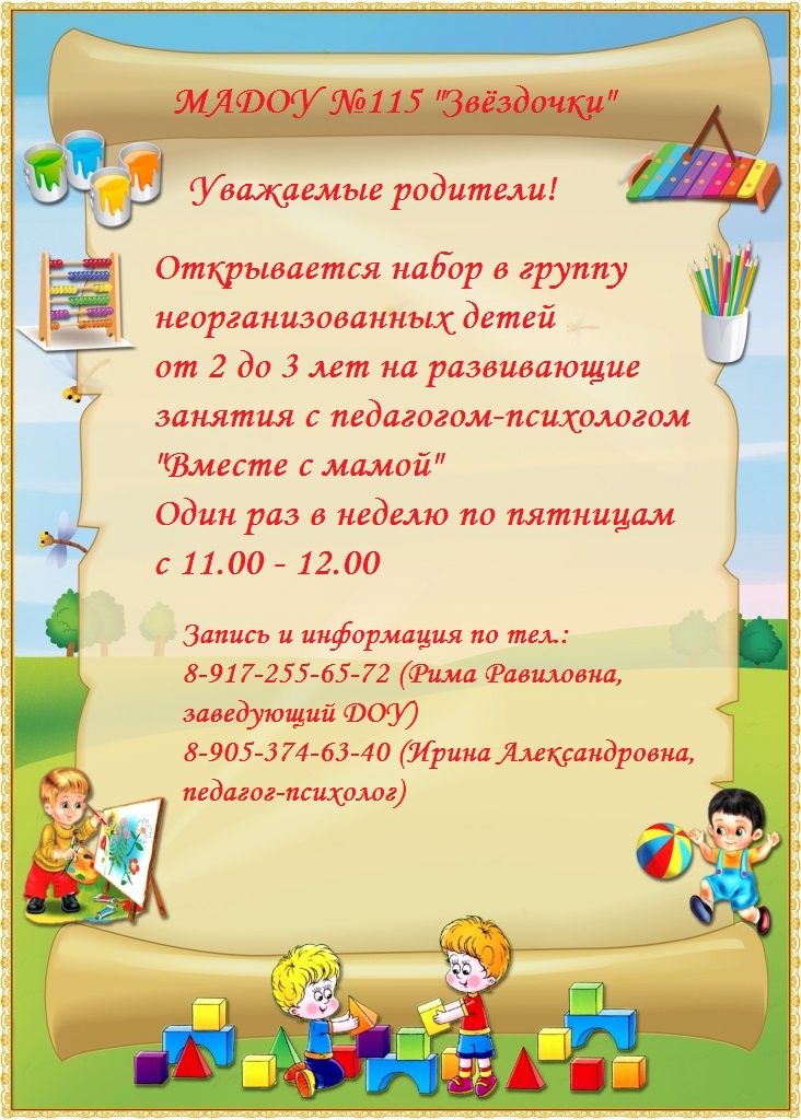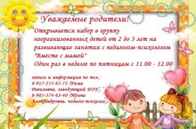 Уважаемые родители! Открывается набор в группу неорганизованных детей от 2 до 3 лет на развивающие занятия с педагогом-психологом "Вместе с мамой". Один раз в неделю по пятницам с 11.00 - 12.00. Запись и информация по тел.: 8-917-255-65-72 ( Рима Равиловна, заведующий ДОУ), 8-905-374-63-40 ( Ирина Александровна, педагог-психолог)