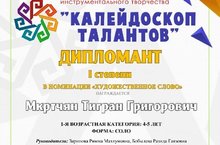 Воспитанник 11 группы Мкртчян Тигран стал дипломантом 1 степени в VI Международном фестиваль -конкурсе "КАЛЕЙДОСКОП ТАЛАНТОВ" в номинации "Художественное слово". Поздравляем, желаем дальнейших успехов.
