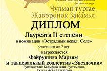 Работа наших педагогов высоко оценивается в конкурсах городского, республиканского, федерального уровней. Дети с огромным желанием участвуют в таких конкурсах и завоевывают дипломы 1, 2, 3 степени, становятся лауреатами. Сегодняшнее утро принесло нам в садик новую победу - Марьям стала Лауреатом 2 степени во всеросийиском вокальном конкурсе "Жаворонок Закамья - Чулман тургае". ПОЗДРАВЛЯЕМ! Выражаем огромноую благодарность руководителям Кадыровой А. Р., Хузиной А. Т.