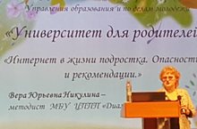 В субботу 21.10.2017г. в рамках проекта управления образования и по делам молодежи «Университет для родителей» и реализации мероприятий программы МБУ «ЦППП «Диалог» «Разноцветный мир» методист Никулина В.Ю. в театральном зале Городского дворца творчества детей и молодежи № 1 провела лекцию для родителей «Интернет в жизни подростка. Опасности и рекомендации».