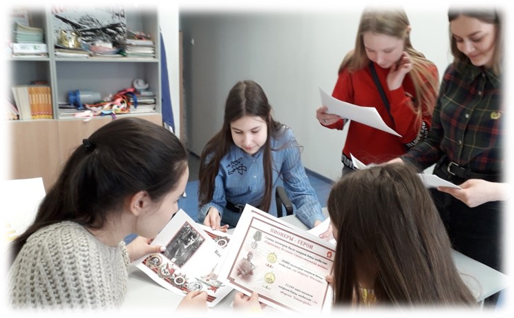 Тимуровцы школы проводят экскурсии в мини музее «Маленькие герои Великой войны». Истории и судьбы детей войны, которые учат нас патриотизму и человечности, мудрости и мужеству, а иногда вызывают смех сквозь слезы. Потому что даже на войне в глубине души дети продолжали быть все теми же вихрастыми мальчишками и озорными девчонками, которым иногда хочется поиграть и пошалить. Такая экскурсия станет для ребят лучшим уроком по истории Великой Отечественной войны.