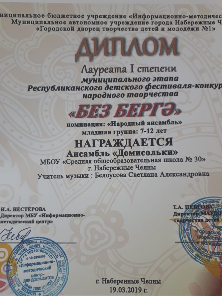 ПОЗДРАВЛЯЕМ ансамбль "Домисольки" с 1 местом в номинации "Народный ансамбль" (младшаяя тгруппа 7-12 лет). Руководитель Белоусова Светлана Алексагдровна.