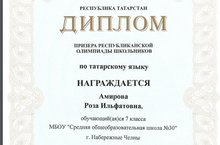 Поздравляем Амирову Розу, призера Республиканской олимпиады школьников по татарскому языку. Желаем дальнейших побед!!