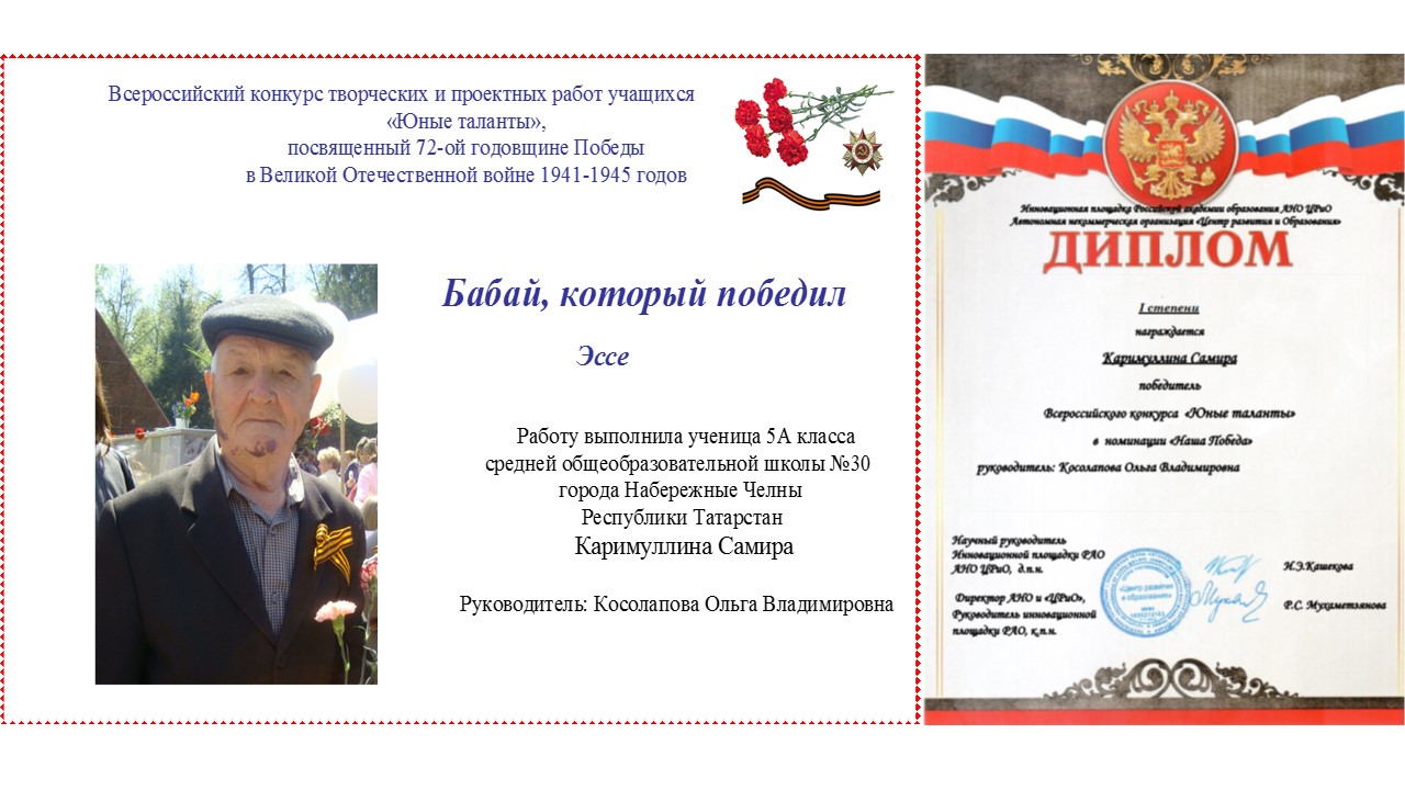 Поздравляем победителей Всероссийского конкурса "Юные таланты" организованного инновационной площадкой Российской академии образования АНО ЦРиОи Автономной некомерческой организацией "Центр развития и Образования" г. Н.Челны.Каримуллину Самиру 5 "а" класс в номинации " Наша победа"Быстренина Егора 5 "а" класс в номинации " Моё портфолио"Желаем учащимся новых побед!ОБЪЯВЛЕНИЕ!!! 27.04.2017