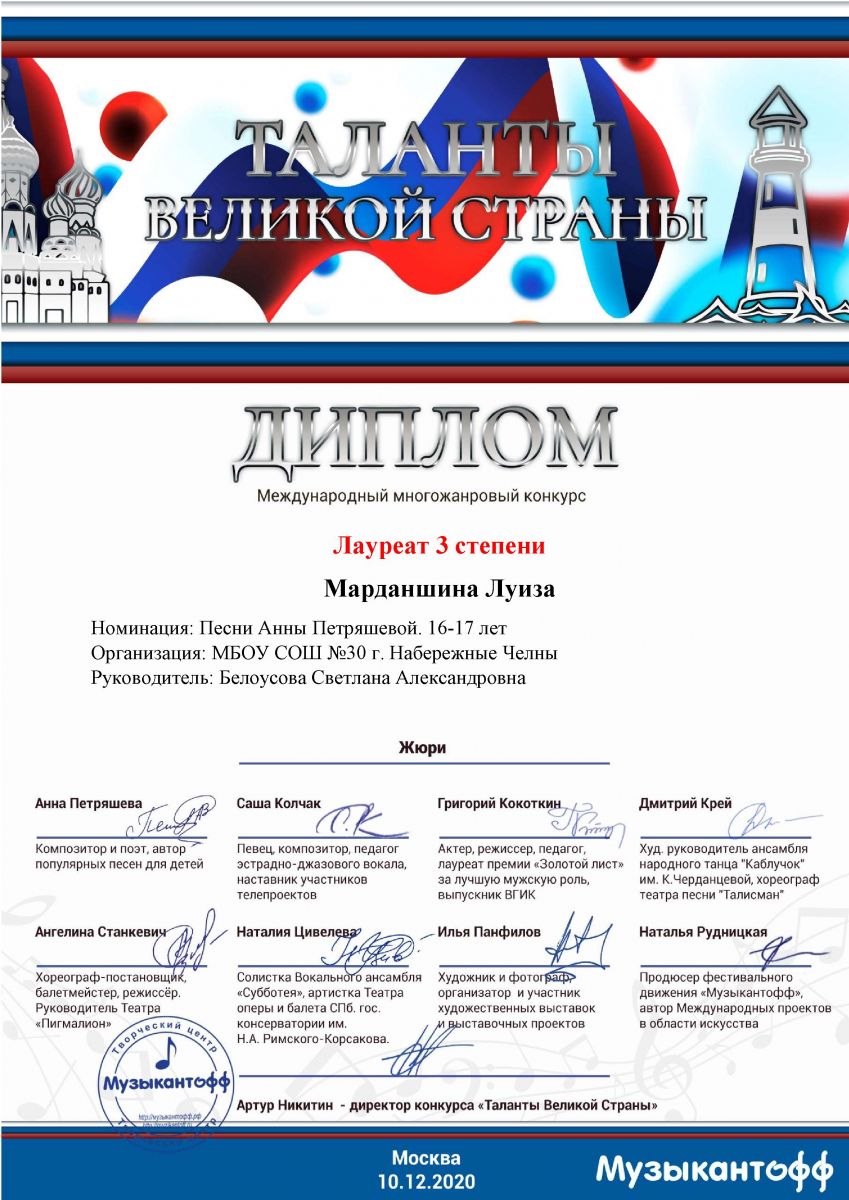Лауреатом 3 степни в Международном многожанровом конкурсе "Таланты Великой страны".