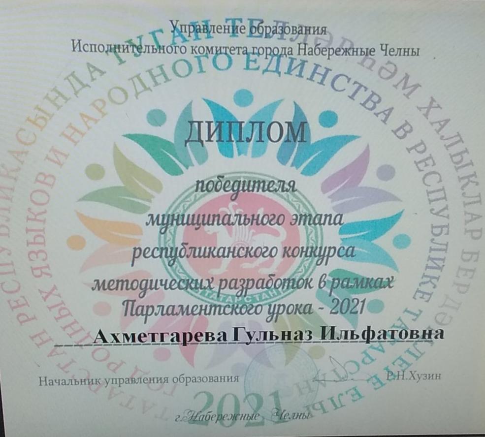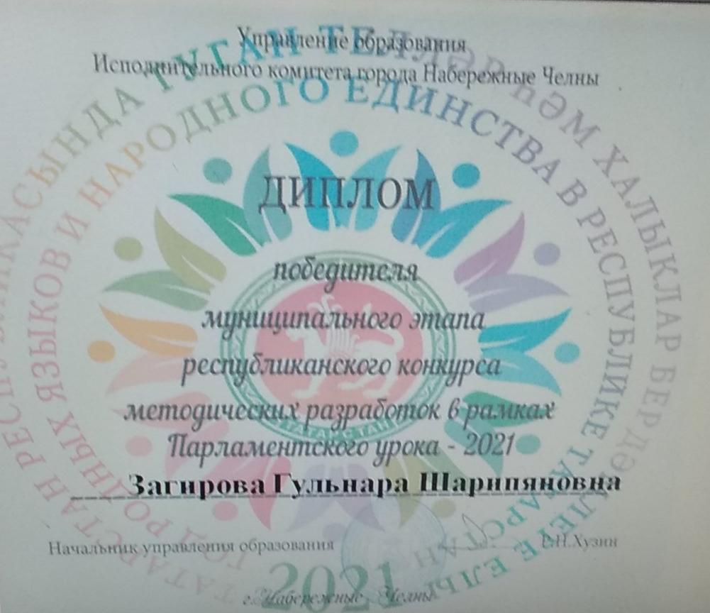 Учителя начальных классов нашей школы Ахметгараева Г.И. и Загирова Г.Ш. стали победителями в муниципальном этапе на конкурсе методических разработок на тему "Татарстан - наш общий дом", в рамках Парламентского урока - 2021, посвященных году родных языков и народного единства.