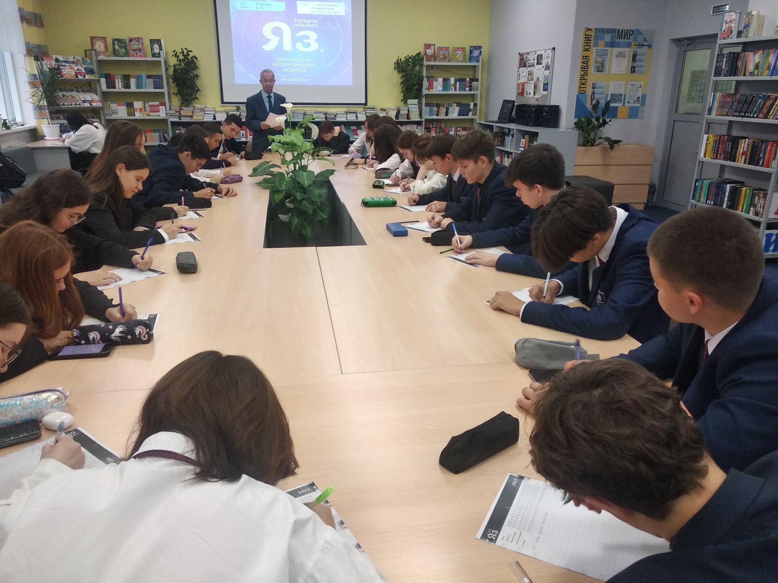 13 октября в нашей школе проводилась Всемирная образовательная акция “Татарча диктант» в целях реализации Государственной программы Республики Татарстан “Сохранение, изучение и развитие государственных языков Республики Татарстан и других языков в Республике Татарстан на 2014-2020 годы”. Акция «Татарча диктант» направлена на повышение интереса к грамотному правописанию, владения литературным татарским языком, самопроверку орфографических и грамматических ошибок. Текст в нашей школе диктовал Шарипов Анвар Магданурович — доктор филологических наук, профессор, академик, заслуженный учитель РТ, член Союза писателей Татарстана.