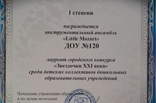 Вот и прошел финал ежегодного городского конкурса "Звездочки XXI века". Юные звездочки нашего сада - инструментальный ансамбль "Little Mozart" занял 1 место! Слова благодарности музыкальному руководителю Тарабриной Елене Викторовне и воспитателю Нигматуллиной Гульшат Ульфатовне. Огромное спасибо всем родителям за поддержку юных дарований.