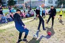 с участием детей, воспитателей и пап наших воспитанников - Фестиваль футбола. Мероприятие наше началось с торжественной части открытия фестиваля под гимн Российской Федерации. Конечно же, прежде чем приступить к серьёзным соревнованиям, необходимо хорошо размяться, поэтому мы провели с ребятами весёлую зарядку. У ребят, как у настоящих футболистов, прошла разминка с различными видами упражнений для рук и ног, ходьбой и бегом под руководством юного игрока Павла, занимающегося игрой профессионально. Спортивные викторины и загадки показали, что наши ребята отлично подкованы в вопросах спорта. Мастер-класс по набиванию мяча от неутомимых пап наших воспитанников привёл в восторг всех участников мероприятия. Зажигательный танцевальный флешмоб от маленьких болельщиц из группы поддержки, организованный воспитателем Эльмирой Радионовной, зарядил всех энергией и укрепил спортивный дух. Соревнования проходили в форме эстафет, при этом ребята активно болели друг за друга. Наши юные спортсмены демонстрировали умение вести мяч, забивать голы в ворота и выполнять змейку, учились передавать мяч друг другу и останавливать ногой. Возможно, не у всех всё получалось с первого раза, но это не убавило пыла у наших начинающих футболистов. Кульминационной частью нашего праздника стал товарищеский матч между воспитателями и папами воспитанников. Матч прошёл в позитивном русле. Азарт игроков и эмоции болельщиков накаляли обстановку на нашем импровизированном поле и периодически вызывали всеобщий дружеский смех. Победила конечно же дружба! Фестиваль доставил огромное удовольствие и детям, и взрослым. Соревнования получились очень яркими и зрелищными. Дети получили большой опыт и незабываемые впечатления. Как и любая спортивная игра, помимо навыков физической выносливости футбол учит таким полезным навыкам, как командный дух, слаженность, дружелюбие, настойчивость и целеустремлённость, развивает ловкость, концентрацию внимания, воспитывает товарищеские взаимоотношения, чувство ответственности за себя и свою команду. Благодарим родителей детского сада за активное участие, воспитателей - за проявленное творчество и помощь в организации и проведении этапов фестиваля. Желаем всем дружить со спортом и играть в футбол! Оле-оле-оле! -