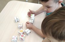 Для развития речевых навыков воспитанников наши педагоги применяют различные дидактические игры. При этом сделать обучающую игру можно из обычных кубиков. Дидактическая игра «Составь предложение из кубиков» помогает малышам получить навыки согласования слов в предложении, воспитывает интерес к грамотному общению. Эта игра состоит из нескольких кубиков, на каждом из которых изображены рисунки, обозначающие разные части речи, цвета, геометрические формы. Для составления фразы или предложения, детям нужно их согласовывать между собой. Соединяем в игре два кубика – предмет и действие. Объединяем в словосочетание выпавшие картинки: «Что это? Что делает?», заодно уточняем у ребенка, бывает ли такое. Например, девочка летит на самолете. Сочетания могут быть как логически правильными, так и невозможными, что вызывает у детей смех и снимает напряжение. С помощью таких игр у ребенка совершенствуется грамматический строй речи, важный для дальнейшего успешного обучения в школе.