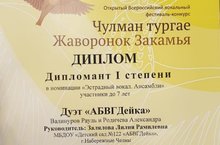 В очередной раз МАУДО города Набережные Челны «Детская музыкальная школа №4» при поддержке Управления культуры Исполнительного комитета города Набережные Челны проводит Открытый Всероссийский вокальный фестиваль-конкурс «Чулман тургае - Жаворонок Закамья – 2021» в номинации «ЭСТРАДНЫЙ ВОКАЛ». Наши юные звездочки Валинуров Рауль и Родичева Александра представляли дуэт "АБВГДейка". Ребята выступили блестяще, покорив жюри с первого взгляда. Поэтому домой вернулись с заслуженной победой, став обладателями диплома I степени. Поздравляем наши юные таланты и их наставника - музыкального руководителя Залялову Лилию Рамилевну - с успехом и желаем покорять новые вершины!