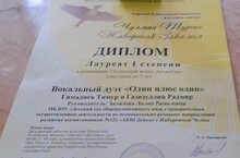 В очередной раз муниципальным автономным учреждением дополнительного образования города Набережные Челны «Детская музыкальная школа №4» при поддержке Управления культуры Исполнительного комитета города Набережные Челны был проведён Открытый Всероссийский вокальный фестиваль-конкурс «Чулман тургае - Жаворонок Закамья». Наши юные таланты Гимадиев Тимур и Газизуллин Радмир представляли вокальный дуэт "Один плюс один" в номинации "Эстрадный вокал. Ансамбли". Отличившись высоким уровнем исполнения конкурсной программы, наши прекрасные талантливые ребята стали обладателями диплома лауреата I степени. Гордимся нашими юными дарованиями! Поздравляем ребят и их наставника - музыкального руководителя Залялову Лилию Рамилевну - с успехом и желаем покорять новые вершины! Пусть жизнь подарит впереди много блестящих возможностей проявить себя и завоевать признание, уважение, почёт и множество памятных наград!