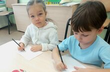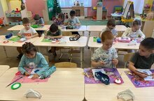 В 10 группе прошло творческое занятие на тему "Аппликация-рисование «Будка для собаки»". Задачи занятия: вызвать у детей желание помочь собачке Соне (по сказке); учить составлять изображение, состоящее из нескольких частей, определять форму, уточнить знание цветов, продолжать учить пользоваться ножницами; продолжать учить выкладывать и наклеивать в определенном порядке детали изображения; продолжать учить правильно наносить клей на деталь, переворачивать ее, придерживая с двух сторон пальцами обеих рук, использовать салфетку.