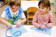 Отличная забава для развития координации и точности движений, зрительного восприятия и логического мышления, творческого начала и самостоятельности - шнуровальный планшет. Игрушка представляет собой игровое поле, в котором имеются отверстия. В комплекте имеются шнурки в различных цветах. Верёвочки выступают в роли красок, их растягивают в желаемом направлении, на нужную длину, крепят их в дырочках. Если с рисунком что-то не вышло, можно небольшим усилием вытянуть шнурок назад и начать работу заново. Шнуровальный планшет абсолютно безопасен, здесь нет гвоздиков и штырьков. В наборе имеются схемы, которые помогают выполнять детям "рисунки". Как только начинает получаться работа по схемам, ребята могут включить фантазию и придумать что-то своё.