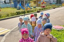 Ребята 7 группы отправились на прогулку дружным цветным "паровозиком"