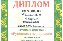Сегодня в МАДОУ "Центр развития - детский сад №1 "Шатлык" прошел фестиваль, посвященный Году родных языков и народного единства "Рукопожатие народов" Наш детский сад представляла семья Галстян Марии Левоновны, воспитанницы старшей группы №7. Участники фестиваля продемонстрировали свои таланты, приняли участие в творческих номерах. Были награждены дипломами и памятными подарками.