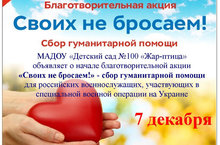 С 7 по 13 декабря в нашем ДОУ проходила благотворительная акция "Своих не бросаем"- сбор гуманитарной помощи для российских военнослужащих, участвующих в специальной военной операции на Украине. Мы благодарны всем за отзывчивость и неравнодушие.