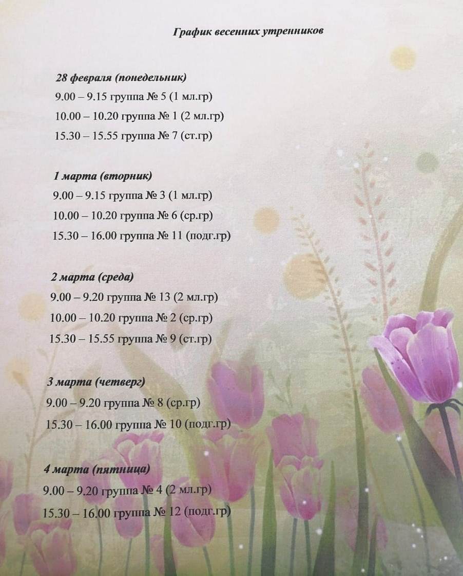 16 февраля9.00 - 9.20 тематическое занятие в средней группе №8 "Армии салют!"15.30 - 16.00 спортивный праздник в подготовительной группе №10 "Защитникам Отечества - Ура! Ура! Ура!17 февраля"Зарница" в рамках городской детской Спартакиады18 февраля9.00 - 9.20 тематическое занятие в средней группе №2 "Армии салют!"22 февраля"Зарница" в старших группах №7, 9 и подготовительных группах №11,1224 февраля9.00 - 9.20 тематическое занятие в средней группе №6 "Армии салют!" -