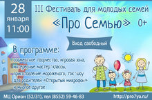 28 января в 11,00 часов в Молодежном цетре "Орион" пройдет III Фестиваль для молодых семей "ПРО СЕМЬЮ" . Вход свободный. С программой вы сможете ознакомится нажав на ссылку "Читать новость" (находится в правом нижнем углу)