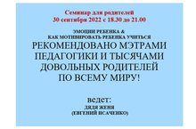 Cеминар для родителей «Эмоции ребенка» 27.09.2022