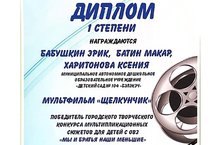 Воспитанники логопедической группы №18 под руководством педагогов Батиной М.А., Офоковой Л.А. создали авторский мультфильм "Щелкунчик", представили на городской творческий конкурс мультипликационных сюжетов "Мы и братья наши меньшие" и заняли почетное 1 место! Поздравляем с победой! Желаем дальнейших творческих успехов и новых интересных мультфильмов!