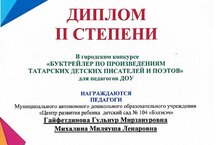 Воспитанники старшей татарской группы №7 под руководством педагогов: Гайфетдиновой Г.М., Михалиной М.Л. победили в городском конкурсе "Буктрейлер по произведениям татарских детских писателей и поэтов" с авторской работой "Буктрейлер по мотивам сказки А.Алиша "Койрыклар" ("Хвосты"), заняв 2 место! Так держать! Поздравляем и желаем творческих успехов!