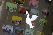 "Мы за мир во всем мире" - выставка творческих работ, обучающихся творческого объединения "Вернисаж" (педагог Серова Т. И.), приурочена к празднику Великой Победы. -