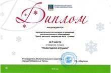 В дни зимних каникул в г. Набережные Челны проходил городской конкурс «Новогодняя игрушка». Наш Центр принял в нем участие и занял почетное II место. Поздравляем! Желаем дальнейших побед!