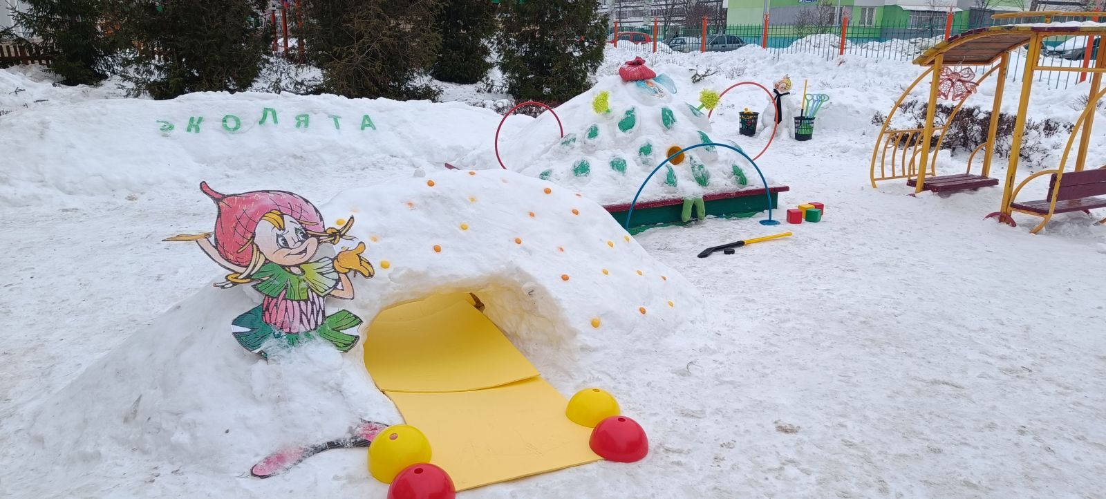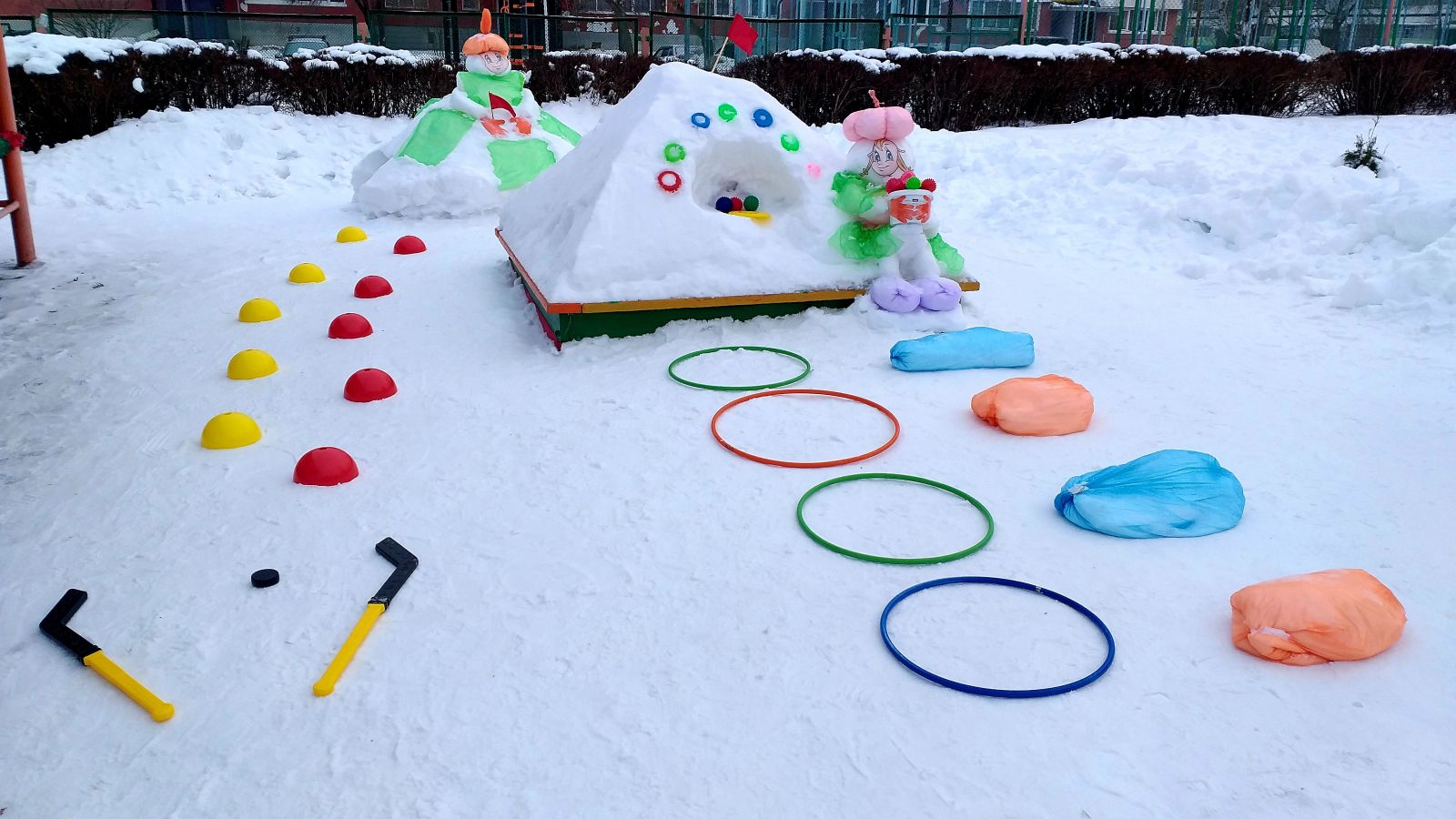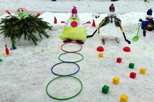 На территории нашего снежного городка есть много полезных построек. На одном участке Эколята созывают нас поиграть с ними в «Весёлые старты». Здесь можно проявить свою меткость в игре «Кольцеброс» и «Попади в корзину», развить координацию прыгая из обруча в обруч и даже почувствовать себя настоящим хоккеистом! На другой площадке Ёлочка и Умница приглашают нас пройти полосу препятствий, ребят ожидают различные задания для подлезания, перешагивания, перепрыгивания. Можно научиться хорошо владеть клюшкой, обводя препятствия змейкой.